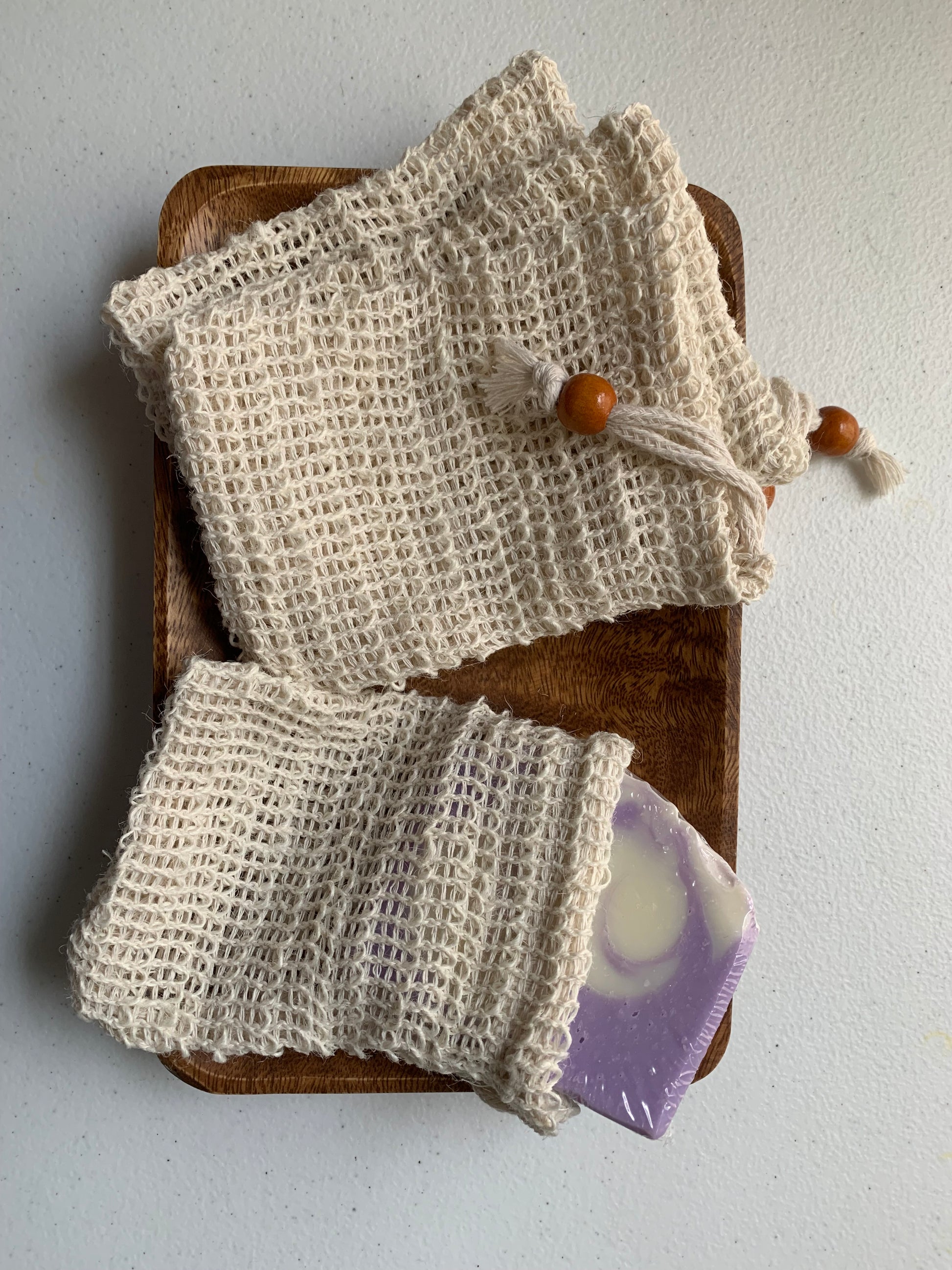 Soap Saver Pouch Sisal Soap Bag with Drawstring and Wooden Bead - approximate size - 3.75" x 5.75"